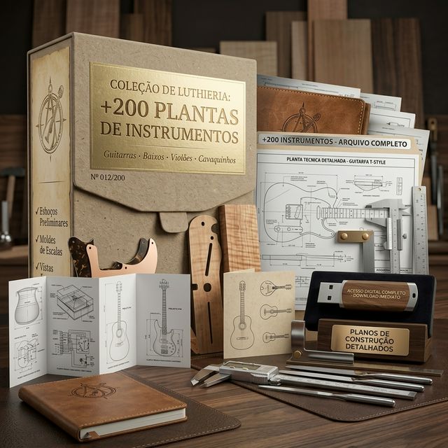 Acesso imediato a projetos de violão, cavaquinho, ukulele, viola, baixo, guitarra e muito mais — prontos para imprimir e começar a fabricar em casa.